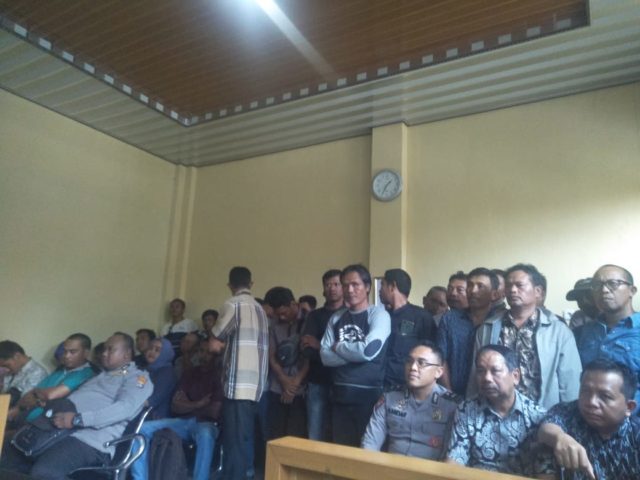 MENGGALA–Sidang ponis perkara tindak pidana penipuan yang dilakukan terdakwa Wagiono bin Ramlan di Pengadilan Negri Menggala di penuhi massa pihak korban Dwi Purwanto. Selasa (21/1/2020).