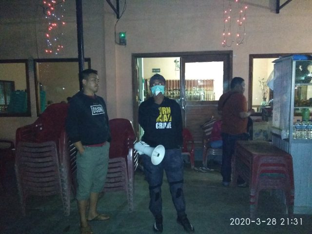 TULANG BAWANG – Personil Tim Tekab 308  dari Polres Tulangbawang melakukan sosialisasi dan pembubaran terhadap puluhan orang, yang berkumpul di kedai kopi RINDU di jalan Ethanol Kampung Tunggalwarga, Kecamatan Banjaragung, Tulangbawang, dan sejumlah kedia lainnya, Sabtu malam, pukul 21.25 WIB (28/3/2020).