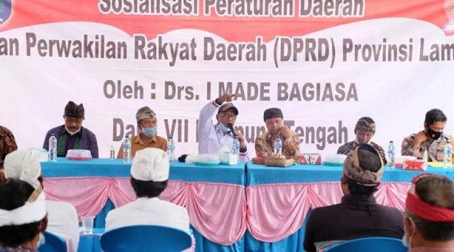 Cahayalampung.com – Wakil Ketua Komisi II DPRD Provinsi Lampung Drs. I Made Bagiasa melakukan sosialisasi Peraturan Daerah (Sosper) Perda Provinsi Lampung Nomor 3 tahun 2020 tentang Adaptasi Kebiasaan Baru (AKB) Dalam Pencegahan dan Pengendalian Virus Covid-19, di Desa Bina Karya Buana Kecamatan Rumbia Lampung Tengah (Lamteng), Sabtu (3/4/2021).