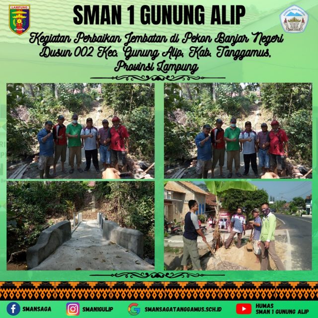 Cahayalampung.com (Tanggamus) – SMAN 1 Gunung Alip yang terletak di Pekon Banjar Negeri Dusun 002 Kecamatan Gunung Alip Kabupaten Tanggamus Provinsi Lampung, bergotong royong memperbaiki salah satu jembatan yang rusak. Dalam kegiatan tersebut melibatkan Komite Sekolah, Guru, Kepala pekon Carfi Juhir dan beserta stafnya.