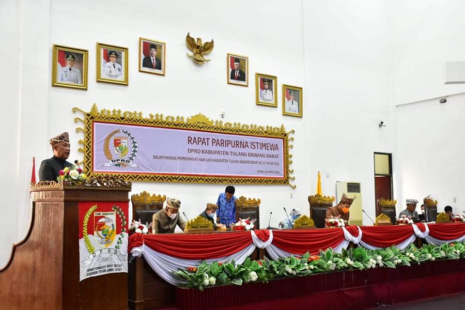 TUBABA–Dewan Perwakilan Rakyat Daerah (DPRD) Kabupaten Tulang Bawang Barat (Tubaba) gelar rapat paripurna Istimewa dalam Rangka Memperingati Hari Ulang Tahun (HUT) Kabupaten Tubaba Ke- 13 Tahun 2022. Acara dihelat di ruang paripurna DPRD. Panaragan, Senin sore (04/04/2022).