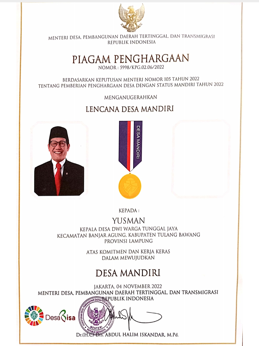 BANJARAGUNG, (CL)– Pemerintah Kampung (Pemkam) Dwi Warga Tunggal Jaya, Kecamatan Banjar Agung, Kabupaten Tulangbawang, sebagai salah satu kampung masuk status Indexs Desa Membangun (IDM) Tahun 2022 mendapat piagam penghargaan dan lencana desa mandiri dari Kementerian Desa, Pembangunan Daerah Tertinggal dan Transmigrasi (PDTT) untuk desa mandiri.