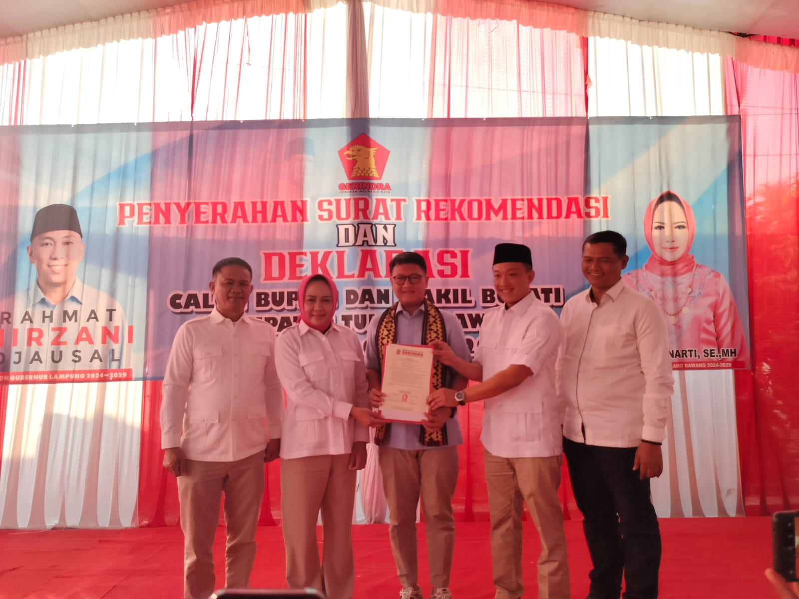 Menggala–Mendapatkan surat tugas dari Dewan Pimpinan Pusat Partai Gerakan Indonesia Raya (DPP Partai Gerindra), Dr. Hj. Winarti SE, sebagai Bakal Calon Bupati dan M. Hi. Reynata Irawan S.TP Bakal Calon Wakil Bupati Tulangbawang dideklarasikan, acara dihelat di halaman sekretariat DPC Gerindra, Menggala, Selasa (06-8).