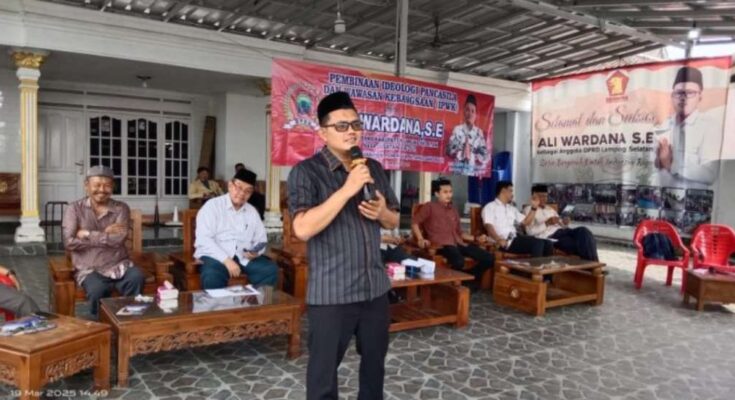 LAMPUNG SELATAN – Anggota Dewan Perwakilan Rakyat Daerah (DPRD) Kabupaten Lampung Selatan (Lamsel) Ali Wardana, SE, menggelar sosialisasi pembinaan Ideologi Pancasila dan Wawasan Kebangsaan (IPWK) di Desa Pasuruan, Kecamatan Penengahan, pada Rabu (19/3/2025).