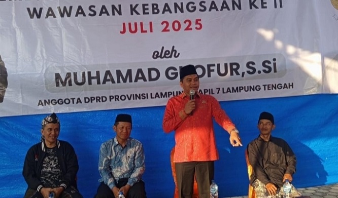 LAMPUNG TENGAH – Anggota DPRD Provinsi Lampung, Muhammad Ghofur sosialisasi Pembinaan Ideologi Pancasila dan Wawasan Kebangsaan (IPWK) di Desa Kalirejo, Kecamatan Kalirejo, Kabupaten Lampung Tengah, Minggu (20/7/2025).
