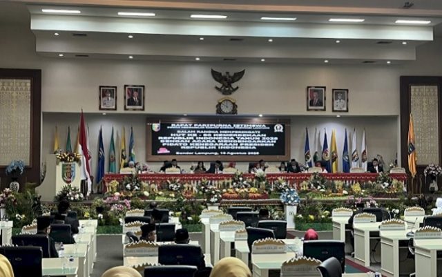 BANDAR LAMPUNG – Gubernur Lampung Rahmat Mirzani Djausal, Wakil Gubernur Jihan Nurlela, unsur Forkopimda Provinsi Lampung, pimpinan dan anggota DPRD Provinsi Lampung, mengikuti Rapat Paripurna Istimewa DPRD Provinsi Lampung mendengarkan Pidato Kenegaraan Presiden Prabowo Subianto dalam rangka Hari Ulang Tahun (HUT) RI ke- 80, secara virtual, di Ruang Sidang DPRD Provinsi Lampung, Jumat (15/8/2025).