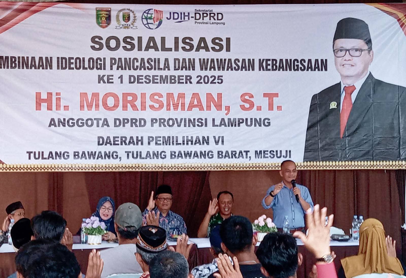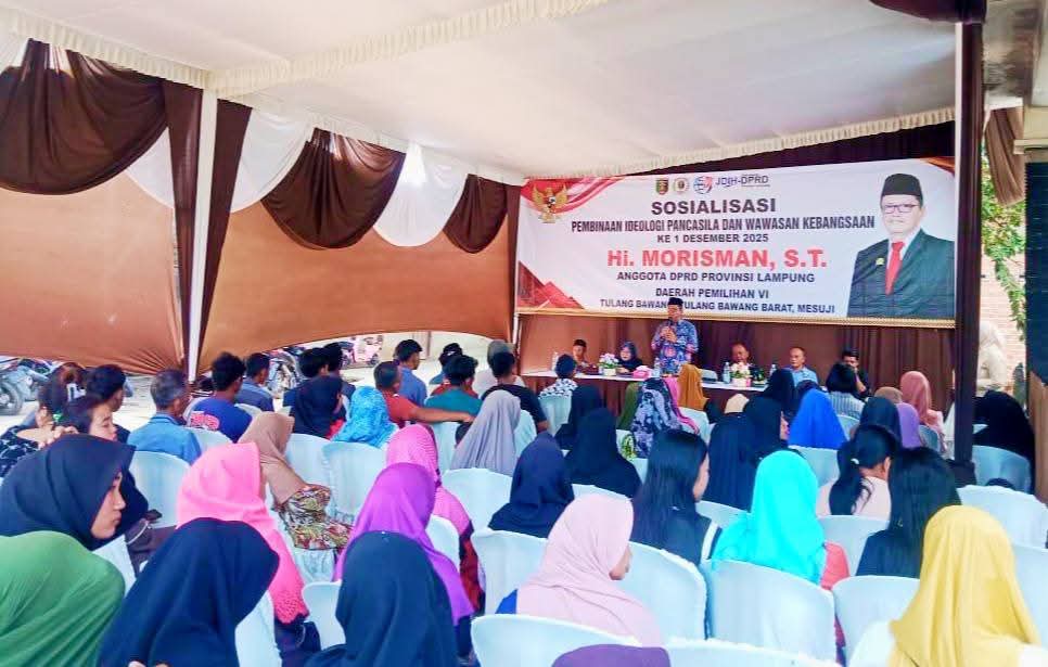 Tulang Bawang, (SMSI)– Ketua organisasi pengusaha, Serikat Media Siber Indonesia (SMSI) Tulang Bawang, Abdul Rohman SH jadi narasumber Sosialisasi Pembinaan Ideologi Pancasila dan Wawasan Kebangsaan (PIP-WK) ke-1, yang dilaksanakan Anggota DPRD Komisi II Provinsi Lampung dari Fraksi PAN Dapil VI H. Morisman, ST, di Kampung Banjar Agung, Kecamatan Banjar Agung, Kabupaten Tulang Bawang, Minggu (7-12-2025).