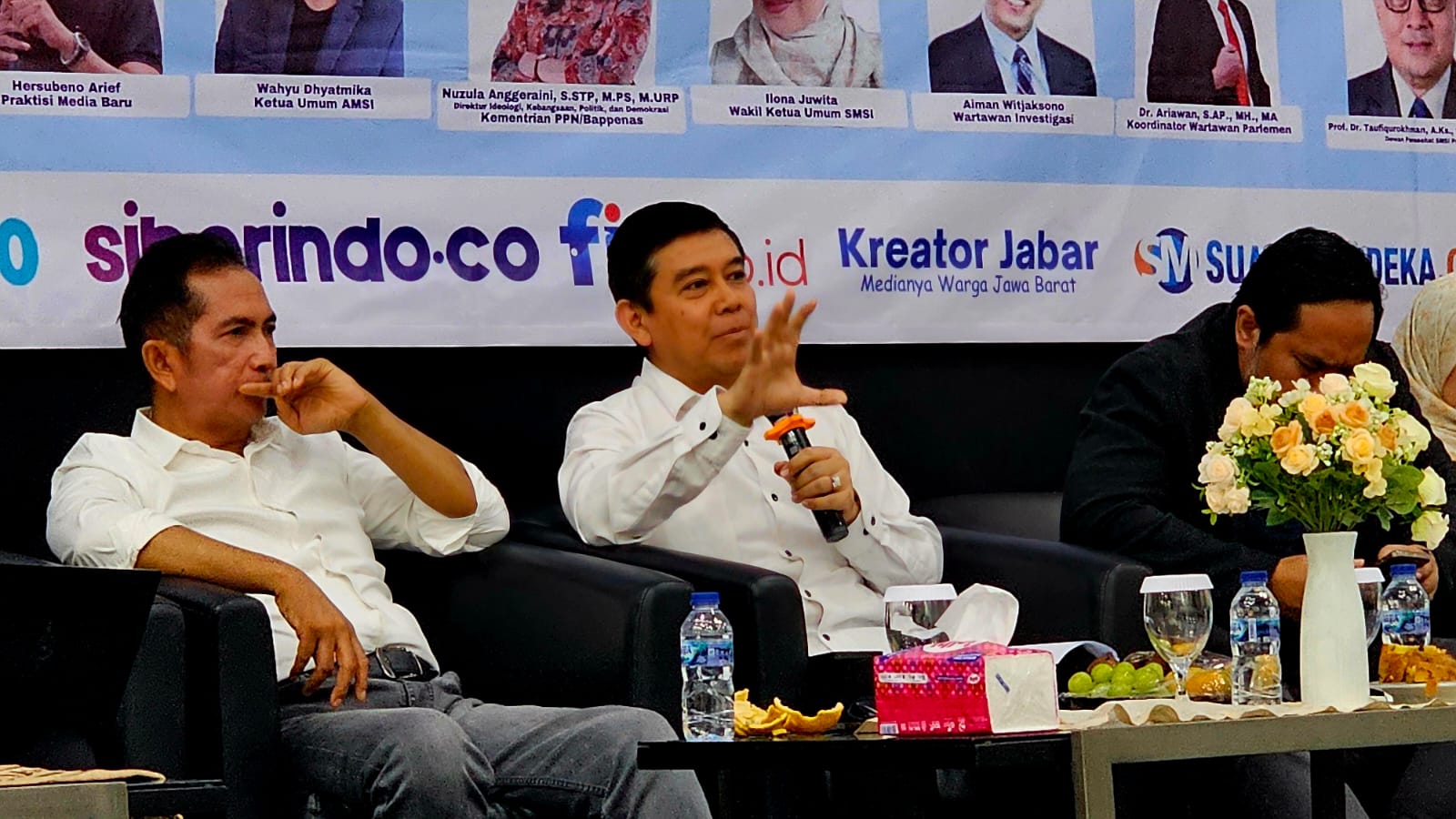 Diskusi dipandu oleh Prof. Dr. Taufiqurachman, A.Ks., Sos., M.Si, dengan menghadirkan sejumlah narasumber dari berbagai latar belakang, antara lain Prof. Dr. H. Yuddy Crisnandi, S.E., M.E (Ketua Dewan Pakar SMSI Pusat), Nuzula Anggerain (Direktur Ideologi, Kebangsaan, Politik, dan Demokrasi Kementerian PPN/Bappenas), Hersubeno Arief (praktisi media baru), Wahyu Dhyatmika (Ketua Umum AMSI), Ilona Juwita (Wakil Ketua Umum SMSI), Aiman Witjaksono (wartawan senior), serta Dr. Ariawan, S.AP., MH., MA (Koordinator Wartawan Parlemen).