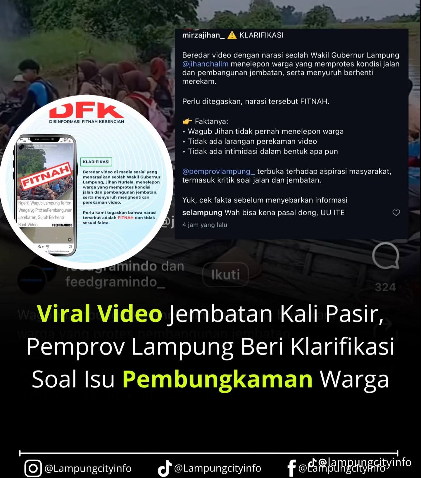“Beredar video dengan narasi seolah Wakil Gubernur Lampung @jihanchalim menelepon warga yang memprotes kondisi jalan dan pembangunan jembatan, serta menyuruh berhenti merekam. Perlu ditegaskan, narasi tersebut FITNAH,” tulisnya.