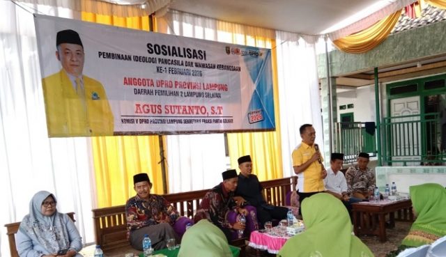 LAMPUNG SELATAN – Anggota DPRD Provinsi Lampung dari Fraksi Partai Golkar, Agus Sutanto, menggelar kegiatan Sosialisasi Pembinaan Ideologi Pancasila dan Wawasan Kebangsaan pertama pada Februari 2026.